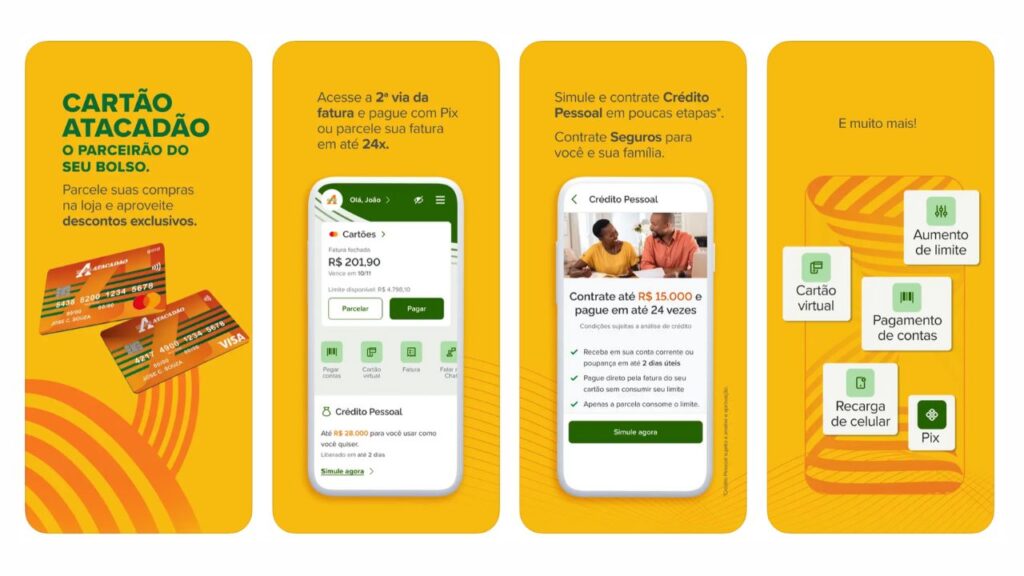 O App Cartão Atacadão facilita a gestão financeira, permitindo acompanhar gastos, gerar faturas, verificar limites e pagar boletos.
