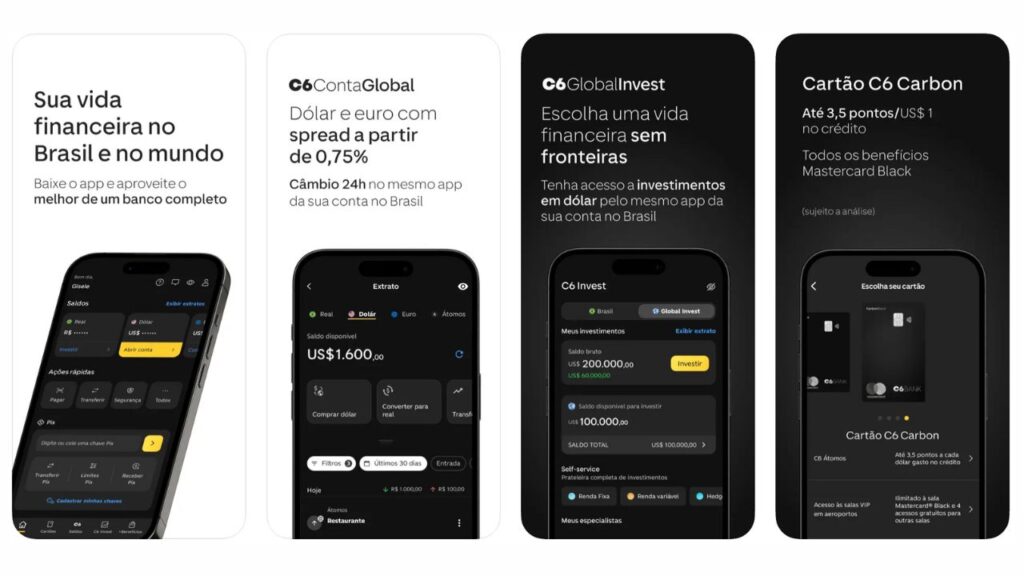App C6 Bank com abertura de conta, gestão de cartões, limites, fatura, contestação e mais.
