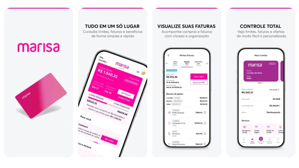 O Cartão Marisa conta com um aplicativo próprio que permite o controle completo das finanças diretamente pelo celular. A experiência é simples e voltada para quem quer acompanhar gastos sem complicação.