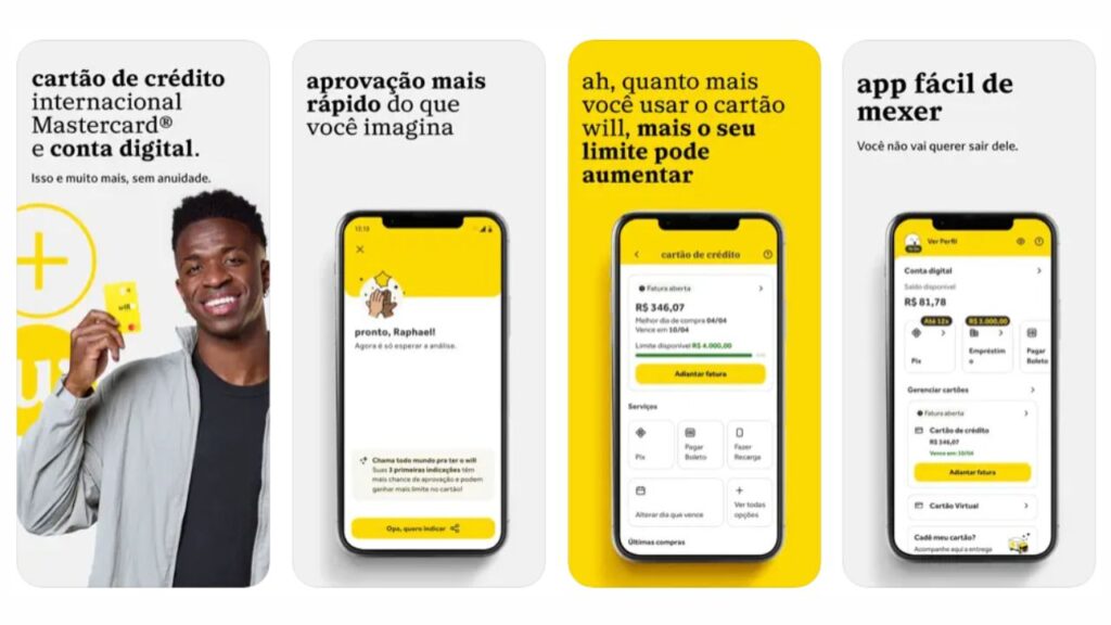 O app Will é o centro da experiência digital do banco. Ele concentra todas as funcionalidades do cartão e da conta:
